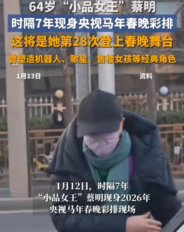 而且就在1月13号的时候,网上曝光了新的去彩排人员的名单,截止到1月12号,已经有几十个人去彩排过了。 但也就是在1月12号,一个熟悉的身影出现了,她就是蔡明,如今64岁的她时隔7年将再次回归春晚。