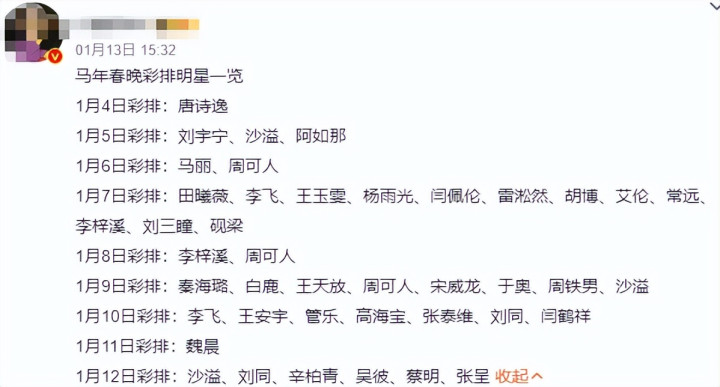 随着日子一天天过去,如今距离马年春晚已经只剩一个月多点了,然而最近这段时间也有很多明星去到春晚的舞台进行彩排。 今年彩排的时间比往年都早一些,从1月初就开始陆续有人出现,有当下很火的流量明星,也有资历比较深的人。
