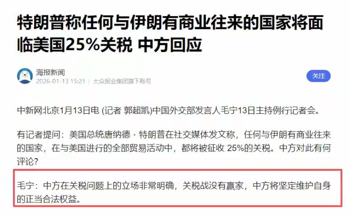 特朗普挥舞关税“大棒”:遏制中国崛起的新荒诞闹剧 2026年1月,特朗普在社交媒体上抛出一则重磅消息:任何与伊朗有贸易往来的国家,在与美国进行交易时,将被加征25%的关税,且该政策立即生效,毫无缓冲期可言。这一威胁看似剑指伊朗,实则暗藏玄机,其真正矛头直指中国,是特朗普妄图遏制中国崛起战略的又一极端且荒诞的“新招数”。 {jz:field.toptypename/}