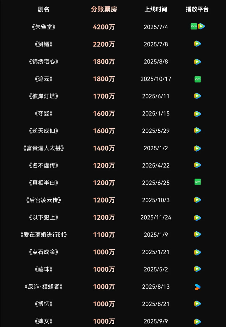 2025分账破千万长剧榜单 第二,这里的分账电影收入并纯非网络电影的收入。 从票房榜单来看,累计4.8亿的票房包括了《毕正名的证明》(分账3612.4万)《大风杀》(分账3417.5万)《无名之辈:否极泰来》(分账2543.8万)等院线电影的网端收入。 这个数字远超2025年纯网络电影的票房产值。