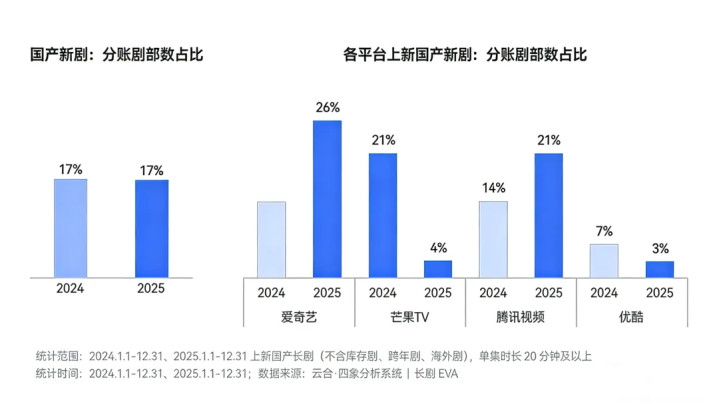 都2026年了,分账剧市场还有拿出单论的必要吗? 以狭义的“分账剧”来评估,回看2025年的分账大盘和剧集品相,确实不复2020年前后,甜宠、古偶竞放,单剧票房破亿的盛况。 但如果将分账内容市场看作一个整体的话,很显然一场剧烈的变动正在发生。 一来,是已经比肩分账长剧的分账微短剧的崛起。这里的分账微短剧,指的是在长视频平台播出的横屏微短剧。 二来,是来势凶猛的中剧、短剧集和网络故事片。 2025年年末,总局电视剧司主持召开的“优化网络视听平台剧集播出生态工作座谈会”明确提出,以中剧、短剧集和网络故事片等中小体量剧集为先行先试类型,探索与制作方进行“保底+分成”的产业模式。 也就是说,“广电21条”中强调重点发展的剧集“新三样”,管理部门为其建议的是分账商业模式。 这就意味着,尽管狭义的分账剧可能已经完成其历史任务,但分账市场却并非寂天寞地,反而大有借势剧集业态创新重上“牌桌”的势头。 在这个背景下,复盘分账剧的存量市场,并在此基础上前瞻增量空间,就显得相当必要。 存量市场有多大? 分账市场过去主要由三部分构成:分账剧、分账横屏微短剧以及网络电影。 过去一年,这三个赛道的总体产值是多少呢? 根据云合数据统计,2025年共305部分账内容公开票房,累计分账13.5亿。 其中,分账长剧19部,累计分账3.1亿;分账横屏微短剧100部,累计分账5.6亿元;分账电影186部,累计分账4.8亿。 不过云合数据的这个统计,有两点需要说明。 第一,305部并非分账内容的全部产量。 以分账长剧为例,2025年各大平台共上新国产剧273部,其中采用分账模式发行的剧集大约占比17%,也就是46部。 其中,公开票房数据的仅19部。