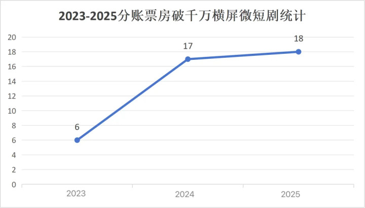 就像开篇提到的,对于剧集“新三样”,管理部门为其建议的商业模式是“保底+分账”模式。并有意以此为试点,进一步推广至常规剧集。这三类剧集备案数量的上升,一定程度上反映了制片方投身分账赛道的热情增长。 而只要制片方与长视频平台能达成“分甘同味、风险共担”的后验合作心态,繁荣分账内容市场的杠杆就有望撬动。 二是横屏微短剧赛道2023—2025年的分账票房增长统计数据。 现存的三个分账内容赛道,唯一处于上行发展周期的是横屏微短剧赛道。 以分账破千万的头部作品为统计对象,2023年各头部长视频平台分账破千万的横屏微短剧为6部,2024年便激增为17部,并出现了像《执笔》(分账2700万)《原罪》(分账2400万)这样票房突破2000万的作品。 到了2025年,不但分账破千万的剧集突破18部,且分账票房纪录也被《朱雀堂》大幅提高至4200万。