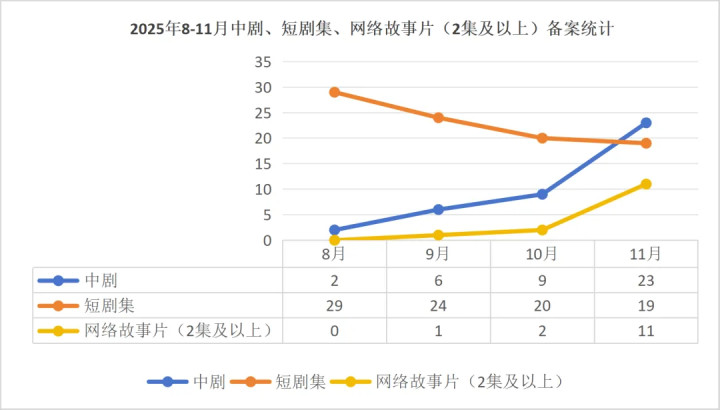 剧集“新三样”的增量空间 那么在剧集赛道,金沙电玩app分账发行模式的比例是否有可能上调呢? 结合以下三个数据,答案应当是肯定的。 一是2025年8—11月,中剧、短剧和网络故事片(2集及以上)的备案部数统计数据。 这是“广电21条”明确提出剧集业态创新以来,已公布的备案信息中剧集“新三样”的备案数统计。 可以看到,这三个内容品类,除短剧集(16集以下长剧)备案数有波动趋势,中剧和网络故事片(2集及以上)的备案部数都呈明显上升趋势。 {jz:field.toptypename/}
