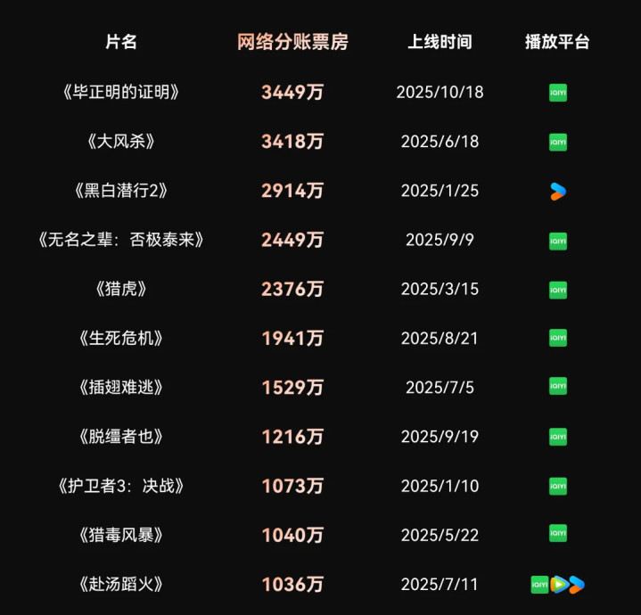 2025票房破千万分账电影 2025年纯网播的网络电影分账票房冠军,实际为优酷独家上线的《黑白潜行2》,分账票房2914.3万。 这个票房表现虽然在2025年的网络电影市场还算亮眼,但是对比2024年的分账票房冠军,也是系列前作《黑白潜行》的3767.1万,以及2023年年冠《奇门遁甲2》3495.4万的票房表现可以看出,纯网络电影的下行发展趋势在过去一年越发明显。 不过,尽管统计数据有诸多限定,但13.5亿这个分账票房数据依旧有意义。它意味着在当下的市场水准下,头部长视频平台能为分账内容投入的预算总量,大概就是这个体量。 也就是说,如果不大幅调整发行模式比例,长视频平台分账内容的存量空间就是13.5亿。