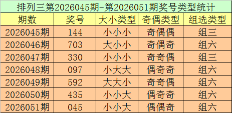 摆设三第2026051期转头:奖号045,奇偶比1:2,大小比1:2,和值9,类型:组六。